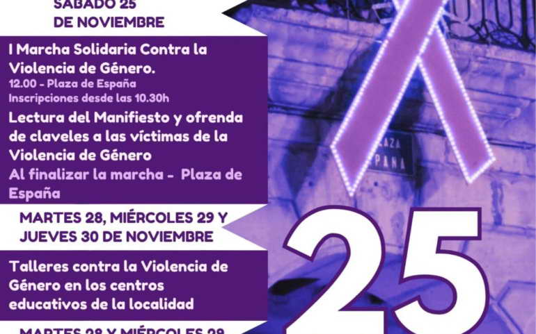 El viernes, 24 de noviembre, y al día siguiente, habrá talleres para los mas pequeños en el Impluvium, mientras que el sábado, 25 de noviembre, se celebrará la I Marcha Solidaria contra la Violencia de Género. Su comienzo está programado para las 12 del mediodía en la Plaza de España y las inscripciones se pueden realizar desde las 10. 30 horas. A su término, y también en la Plaza de España, se dará lectura a un manifiesto y se llevará a cabo una ofrenda de claveles a las víctimas de violencia de género.