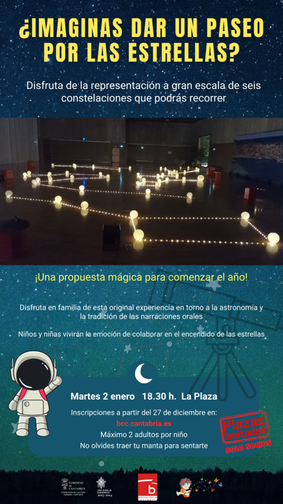 La Biblioteca Central de Cantabria acoge un taller para pequeños y mayores, dirigidos por Cruz de Celis, responsable de Mariposas en la Mochila. Se trata de una original experiencia en familia en torno a la astronomía y la tradición de las narraciones orales. Una representación a gran escala de las seis constelaciones.