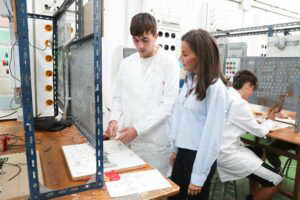 La Reina, junto a los alumnos de formación profesional del IES “Doctor José Zapatero Domínguez” de Castro-Urdiales en los talleres de electricidad y el aula ATECA.