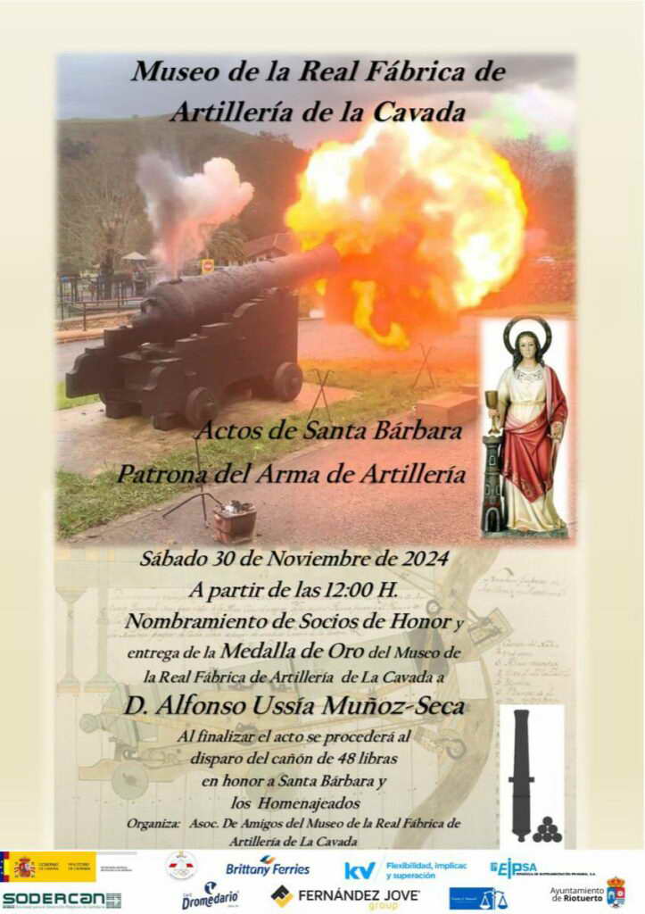 Con motivo de la celebración de Santa Bárbara se celebra el acto de nombramientos de Socios de Honor y entrega de la Meda de Oro, del Museo de la Real Fábrica de Artillería de La Cavada 2024. El acto de entrega de las distinciones, se realizará el 30 de noviembre de 2024 a las 12:00 en el recinto del Museo. El acto finalizará con el disparo del cañón de 48 libras.