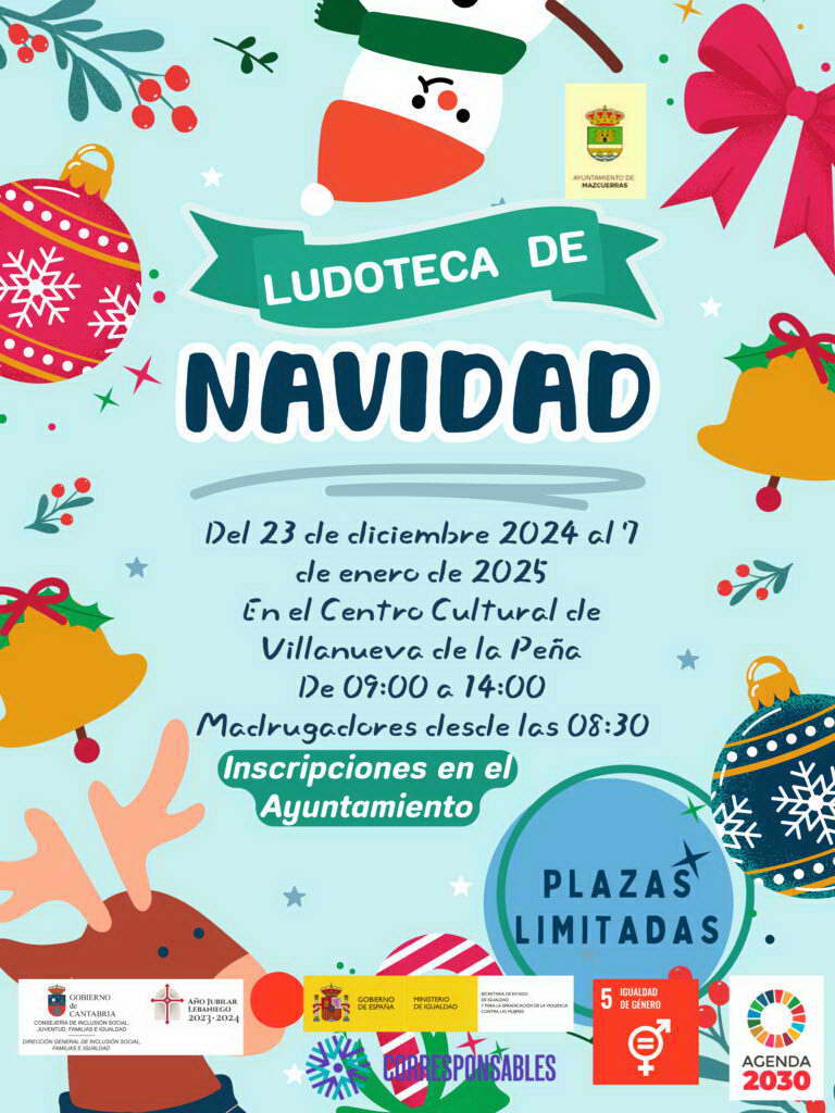 Del 23 de diciembre de 2024 al 7 de enero de 2025, coincidiendo con el periodo no lectivo, el Ayuntamiento de Mazcuerras ha organizado una ludoteca temática relacionada con la Navidad que se llevará a cabo, en el Centro Cultural de Villanueva de la Peña en horario de 8:30 a 14:00 horas.