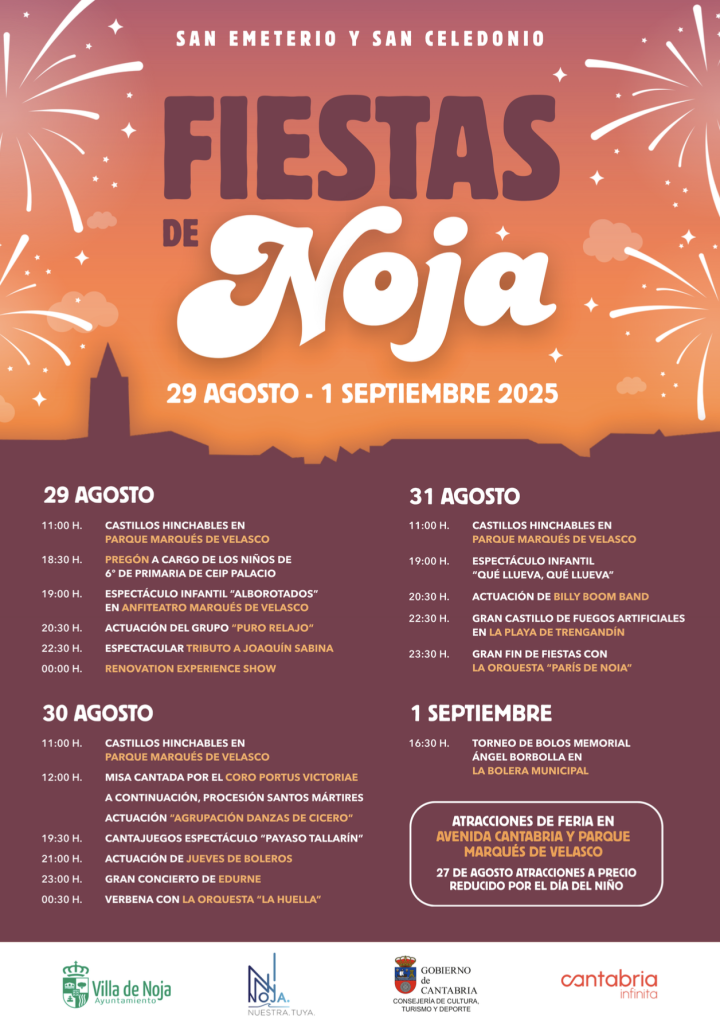 Las fiestas patronales de Noja darán comienzo el 29 de agosto con la apertura de divertidos castillos hinchables por la mañana, a las 11:00 horas, para los más pequeños. Mientras, la localidad hará los últimos preparativos para la celebración del tradicional pregón a las 18:30 horas a cargo de los niños de 6º de Primaria del CEIP Palacio.