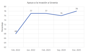 La mayoría expresa orgullo de su historia (94%), de su influencia política en el mundo (74%) y de sus logros culturales, militares y económicos (88%, 82% y 57%, respectivamente); dan prioridad a ser una nación temida y respetada (55%) en detrimento de un buen nivel de vida (41%) y tres de cada cuatro apoyan la ‘acción militar en Ucrania’ de la que piensan saldrán victoriosos (76%). Aunque hay algunos indicios de que el apoyo continuo al conflicto podría estar suavizándose —el 61% cree que es hora de iniciar negociaciones de paz frente al 54% en 2024— la falta de deserciones, motines y rendiciones a gran escala sugiere que no ha habido una fractura importante de su voluntad de vencer.