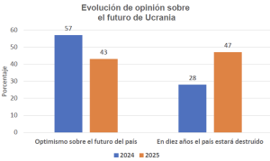 Aunque el carácter imperativo de la resistencia a la invasión rusa no se ve realmente cuestionado en Ucrania, el compromiso masivo inicial se desvanece (gráfico 3). Hrushetsk precisa que «sólo el 43% de la población se muestra optimista sobre el futuro del país, frente al 57% en 2024, y el 47% piensa que en diez años el país estará destruido y azotado por una huida masiva de la población en contraste con el 28% del año anterior» ; Vigers, citando a Gallup, señala «que el 69% de los ucranianos considera que se debería negociar el fin de la guerra lo antes posible».  Gráfico 3: Disminuye la confianza ciudadana en el futuro de Ucrania