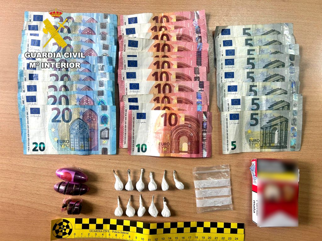 Durante la intervención de la Guardia Civil identificando a los mismos, se acercó una mujer, a la cual uno de ellos le hizo entrega del perro que paseaba, e intentó darle una cajetilla de tabaco, siendo interceptada la misma por los agentes. En el interior de la cajetilla se hallaron 11 bolsitas de cocaína y hachís dividido en 8 trozos, todo ello preparado para su distribución al menudeo. Además, al hombre que portaba la cajetilla de tabaco se le intervino dinero fraccionado en billetes de 20, 10 y 5 euros, no descartándose que procediera de otras ventas de estupefacientes. Finalmente se procedió a la detención de uno de los varones por presunto delito de tráfico de drogas, y a la mujer como cómplice del anterior.