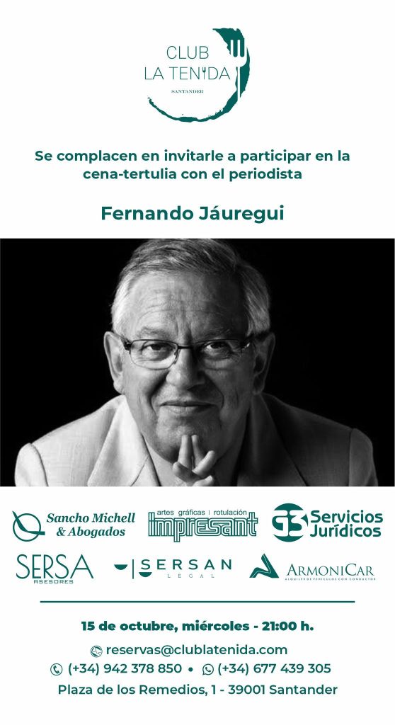 La próxima cena-tertulia, tendrá lugar el próximo 15 de octubre, miércoles, y contará con la intervención y participación del periodista santanderino Fernando Jáuregui. El encuentro gastronómico tendrá lugar en el Hotel Coliseo de la Plaza de los Remedios, 1, en Santander.