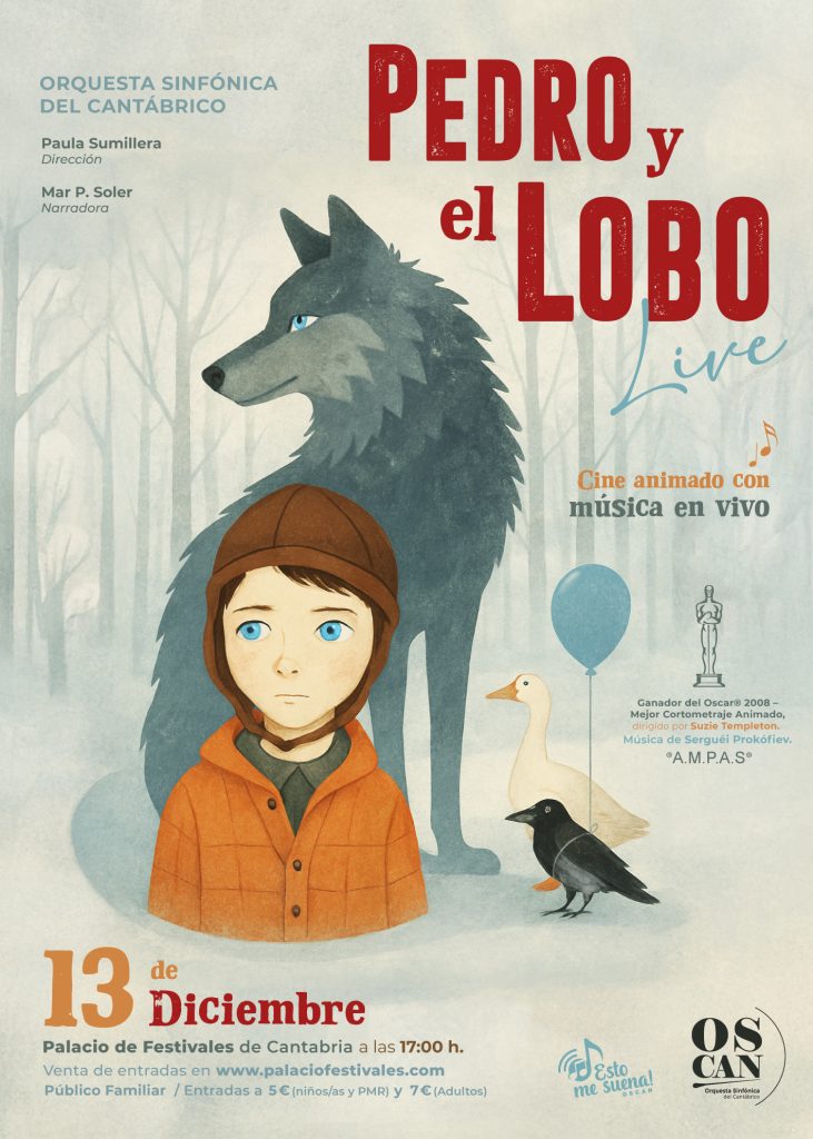 Es importante recordar que el 13 de diciembre, a las 11 horas en taquilla y a través de la página web, se pone a la venta el 10% del aforo del evento, que es obligatorio reservar para cada día de función, representación, concierto o recital en cumplimiento de la Ley de Espectáculos de Cantabria.   ‘Pedro y el lobo’ de Sergei Prokófiev cobrará vida de una forma muy especial: la Orquesta Sinfónica del Cantábrico (OSCAN) acompañará la proyección de la aclamada película animada de Suzie Templeton, ganadora del premio Oscar al Mejor Cortometraje de Animación.   En ‘Pedro y el lobo Live’ cada personaje de la historia está representado por un instrumento de la orquesta. La cálida sonoridad de las cuerdas nos presenta a Pedro,  valiente y decidido. El pajarito, ágil y juguetón, cobra vida a través de la flauta. El pato, entrañable y algo torpe, se dibuja con el oboe. El gato, sigiloso y elegante, se desliza gracias al clarinete. El abuelo, gruñón, pero protector, habla con la voz grave del fagot. Y el lobo, con su amenaza latente, se impone con la fuerza oscura de los cornos franceses.