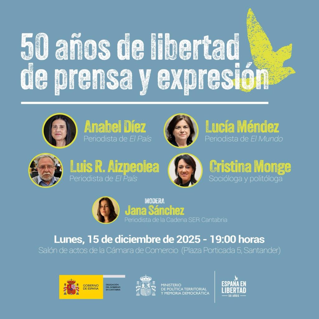 Con presencia de Anabel Diez, Periodista de El País; Lucía Méndez, Periodista de El Mundo; Luis R. Alzpeolea, Periodista de El País; Cristina Monge, Socióloga y politóloga; y con la moderación de Jana Sánchez, Periodista de la Cadena SER Cantabria. Destacado cartel periodístico y social en el salón de actos de la Cámara de Comercio de Cantabria, este próximo lunes 15 de diciembre desde las 19.00 h., con la organización de la Delegación del Gobierno de España, del Ministerio de Política Territorial y Memoria Democrática de España en un evento recogido en la conmemoración de España en Libertad, 50 años de Democracia.