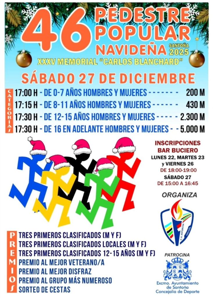 Santoña se prepara para la 46ª Edición de la Carrera Pedestre Popular Navideña «XXXV Memorial Carlos Blanchard». La Concejalía de Deportes del Excmo. Ayuntamiento de Santona, en colaboración con el club La Santona, anuncia la celebración de la 46ª edición de la Carrera Pedestre Popular Navideña, que rendirá homenaje un año más al deportista local bajo el nombre de «XXXV Memorial Carlos Blanchard». El evento, que se ha consolidado como una tradición deportiva ineludible en las fiestas, tendrá lugar el próximo SÁBADO 27 DE DICIEMBRE.