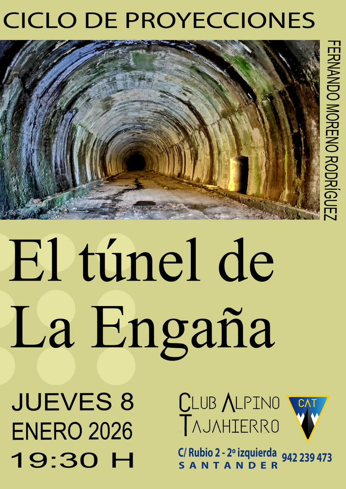 «El túnel de La Engaña lo calaron hombres que simulando ser poco demostraron ser tanto». Este próximo jueves 8 de enero a las 19:30h, en el ciclo de proyecciones del Club Alpino Tajahierro, se conocerá su historia y se rendirá un sentido homenaje a las personas que trabajaron y construyeron el túnel. El ponente será Fernando Moreno Rodríguez. Entrada libre hasta completar el aforo. Fecha: jueves, 08/01/2026 / Lugar: Club Alpino Tajahierro