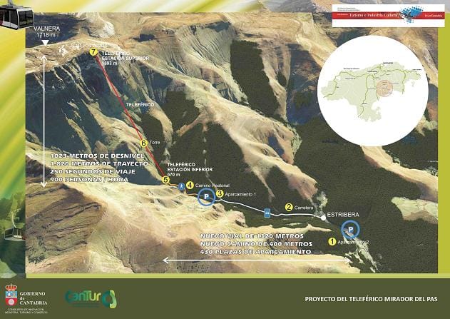 Los documentos que hoy publica el BOC recogen, entre otras cuestiones, un análisis de las posibles soluciones y alternativas técnicas, en función de las características del terreno y de los requerimientos de uso, así como la definición de las obras complementarias de acceso, el suministro, edificaciones e instalaciones.   El objetivo es comunicar mediante transporte por cable el fondo del valle próximo a Vega de Pas con alguna de las cimas o cerros próximos al Castro Valnera y al límite autonómico, para poner en valor y dar a conocer el territorio y montes pasiegos.   Así, la zona de actuación se localiza en la vertiente occidental de la Cordillera Cantábrica, en las proximidades del Puerto de Estacas de Trueba, que separa Cantabria de la provincia de Burgos.   Los barrios o núcleos de población más cercanos al punto de partida del teleférico son Pandillo o Yera, pertenecientes ambos al término municipal de Vega de Pas y ubicados a 65 km de Santander.   Se prevé que las cabinas tengan una capacidad de 40 viajeros (350-375 personas/hora), y alcancen una velocidad máxima de 10 m/s.