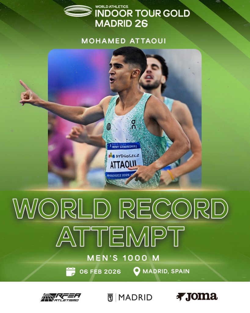 El CDM Gallur se preparar para vivir un nuevo récord del mundo cinco años después. Primero fue Yulimar Rojas en 2020. Luego Grant Holloway en 2021. Y el próximo 6 de febrero será Mohamed Attaoui quien buscará sumarse a esa privilegiada nómina de leyendas en el World Indoor Tour Madrid, la cuarta cita del circuito mundial de World Athletics en categoría Gold. Lo hará en los 1000 metros, la distancia universal que une a atletas y corredores de todos los niveles.