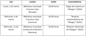 La edil ha avanzado que la primera de las proyecciones, “Sagas de mujeres en Piélagos” tendrá lugar el lunes, 2 de marzo, en la Biblioteca municipal de Renedo; la segunda, “Mujeres emprendedoras de Piélagos” el miércoles, día 4, en la Biblioteca municipal de Liencres y la tercera y última, “Mujeres referentes de Piélagos” el miércoles, día 11, en la Biblioteca municipal de Mortera.   En todos los casos, ha dicho, las sesiones abiertas al público, tendrán lugar, a las 18:30 horas, y contarán con la presentación a cargo de algunas de las mujeres participantes en el documental.   A continuación, se procederá al visionado del mismo y, por último, se realizará un coloquio en el que podrán participar todas las personas asistentes al acto.