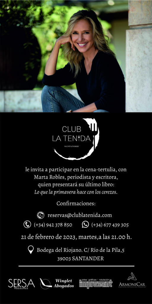 El Club La Tenida organiza una cena-tertulia con la periodista y escritora Marta Robles, quien presentará su último libro: “Lo que la primavera hace con los cerezos”. La cita será en la Bodega del Riojano, el martes 21 de febrero a las 21:00 horas. Confirmaciones en reservas@clublatenida.com y en los teléfonos 942378850 y 677439305. Después […]