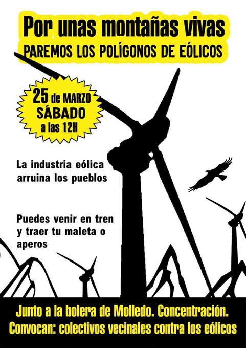 Este sábado 25 de marzo a las 12 horas, los colectivos vecinales contra los polígonos eólicos de Cantabria, convocamos una concentración junto a la bolera de Molledo bajo el lema