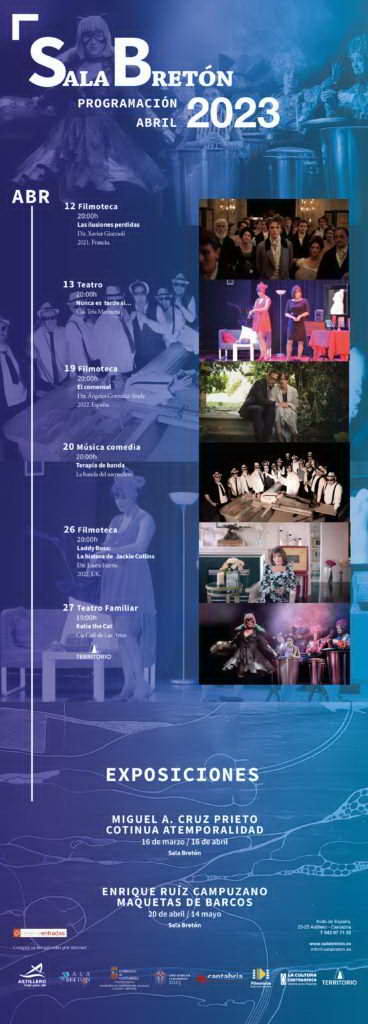 El Ayuntamiento de Astillero lanza la nueva programación de la Sala Bretón para el mes de abril. Un programa completo y diverso con opciones culturales y de ocio para pequeños y mayores, entre las que destaca el teatro familiar, el cine de la filmoteca y la música en directo. La Filmoteca de Cantabria volverá a cobrar protagonismo, con hasta tres películas proyectadas, todas ellas a las 20:00 horas: ‘Las ilusiones perdidas’ (12 de abril), ‘El comensal’ (19 de abril) y ‘Lady Boss: La historia de Jackie Collins’ (26 de abril).