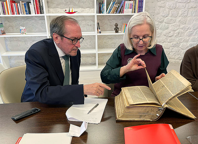La Fundación Comillas ha contado con la presencia de la catedrática de Bibliografía Mercedes Fernández Valladares para realizar la colación del volumen. Su trabajo permitirá facilitar la identificación, recuperación y acceso del ejemplar para investigadores, que podrán localizarlo y trabajar con él a partir de ahora. Doctora en Filología Hispánica y catedrática de la Universidad Complutense de Madrid, Fernández Valladares es una de las principales expertas en bibliografía literaria retrospectiva y análisis material del libro antiguo. Su trayectoria incluye estudios sobre impresos burgaleses del siglo XVI, pliegos sueltos, relaciones de sucesos e investigaciones sobre incunables y post- incunables. El director de la Fundación Comillas, Dámaso López, ha destacado “el privilegio de asistir a la colación de un post-incunable por parte de la profesora Fernández Valladares” y ha subrayado “el valor excepcional de contar con esta obra en los fondos de la institución”.
