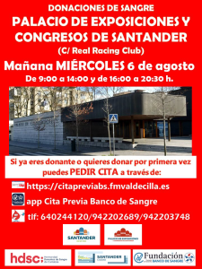 Santander dona sangre en el Palacio de Exposiciones este miércoles día 6, de 09.00 a 14.00 h. y de 16.00 a 20.30 h. 05/08/2025