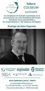 El Club La Tenida de Santander, con Rodrigo Rato, jueves 18 de septiembre, 21.00 h. en el Hotel Silken Coliseum 16/09/2025
