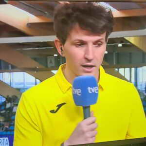 El atleta arandino Juan Carlos Higuero y Pedro San Esteban, en el Mundial de Atletismo Sub-20, con TVE 26/08/2024