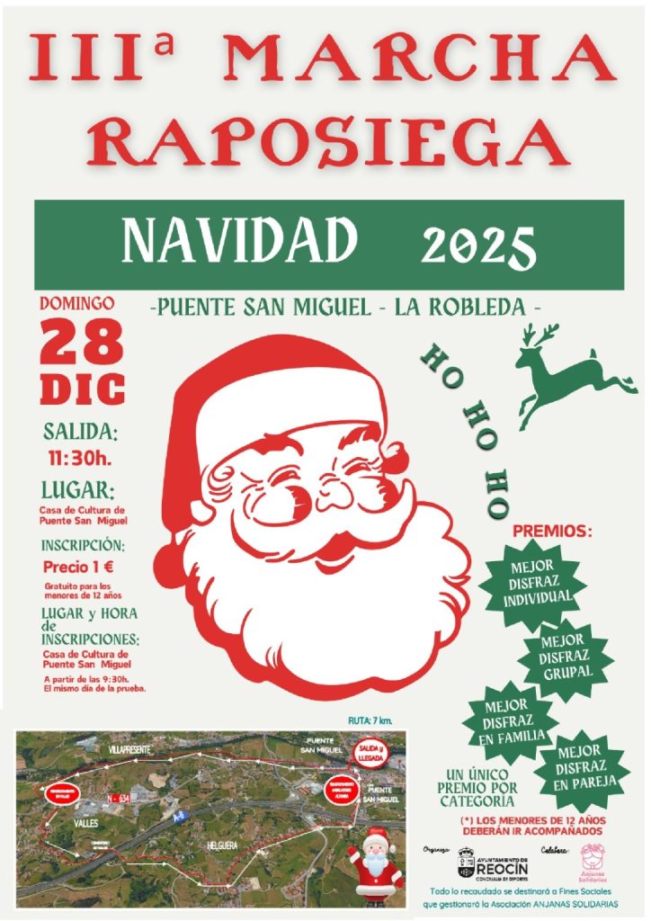 Dentro de la programación ‘Reocín de Navidad’, el próximo domingo 28 de diciembre se celebrará la III Marcha Raposiega. Una marcha no competitiva, de carácter lúdico, familiar y solidario, destinando la recaudación íntegra a la asociación Anjanas Solidarias.   La concejala de Deportes, Margari Martínez, ha recordado que el objetivo es “hacer un poco de deporte y disfrutar de una jornada con amigos y familia en un ambiente navideño y de buen humor”.   Esta marcha, ha señalado Martínez, sigue la tradición de las san silvestres pero “pensando en quienes no quieren competir, sino solo divertirse”.