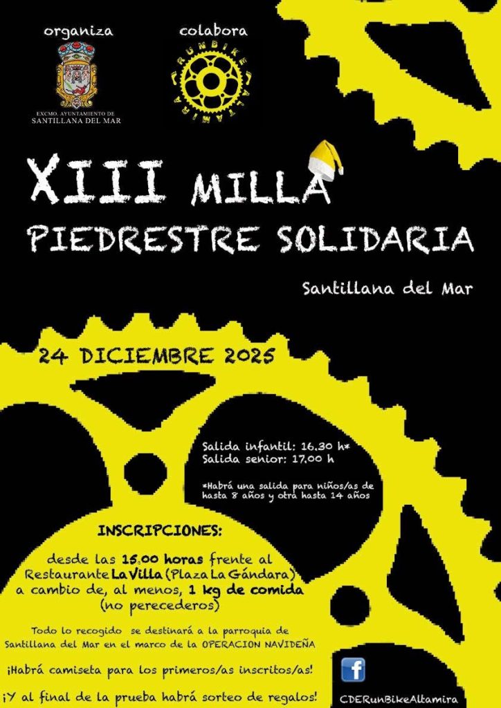 El Excelentísimo Ayuntamiento de Santillana del Mar, con la colaboración del club CDERunBikeAltamira, anuncia la celebración de la XIII Milla Pedestre Solidaria el próximo martes, 24 de diciembre de 2025. Este evento deportivo y social tiene un marcado carácter benéfico, enmarcado dentro de la «Operación Navideña» del municipio. La prueba de carrera popular está abierta a todas las edades y busca la participación ciudadana para recaudar alimentos no perecederos destinados a la parroquia local.